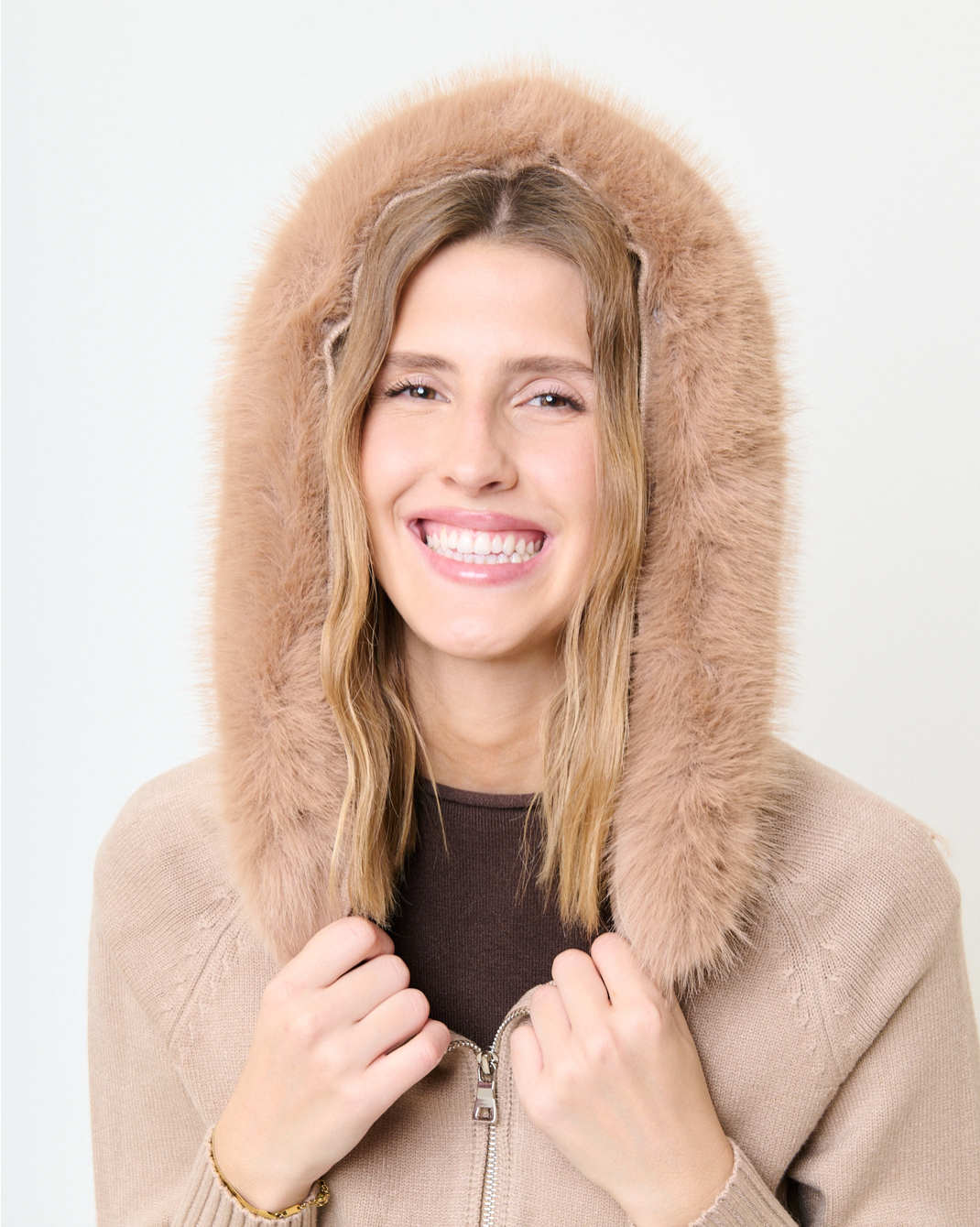 FEEL Cardigan with Zipper Faux Fur Collar - Beige