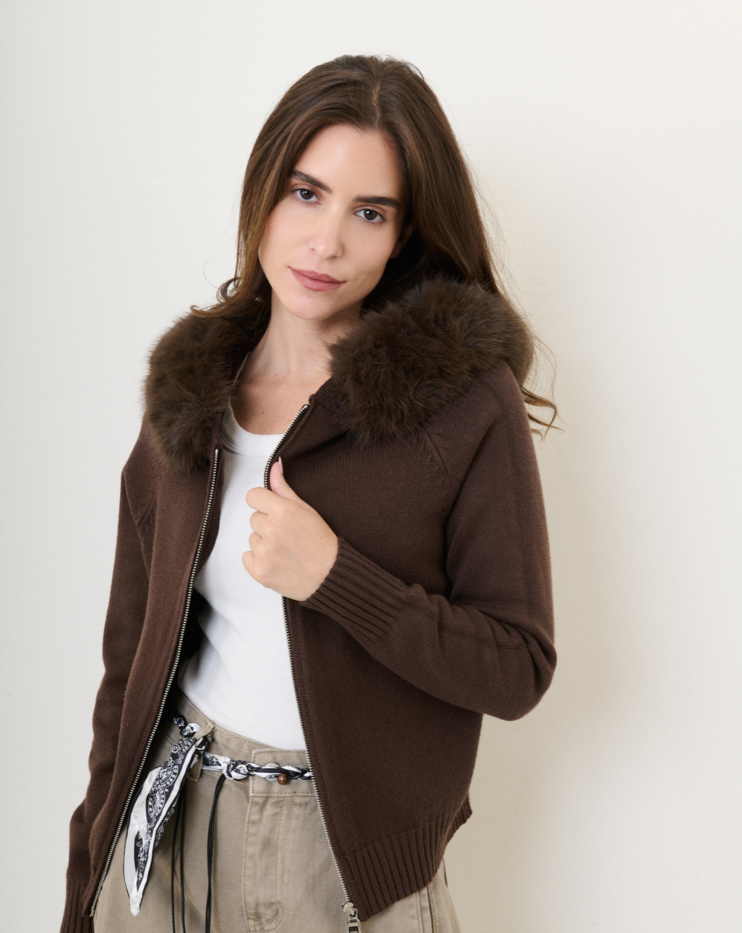 FEEL Cardigan with Zipper Faux Fur Collar - Brown