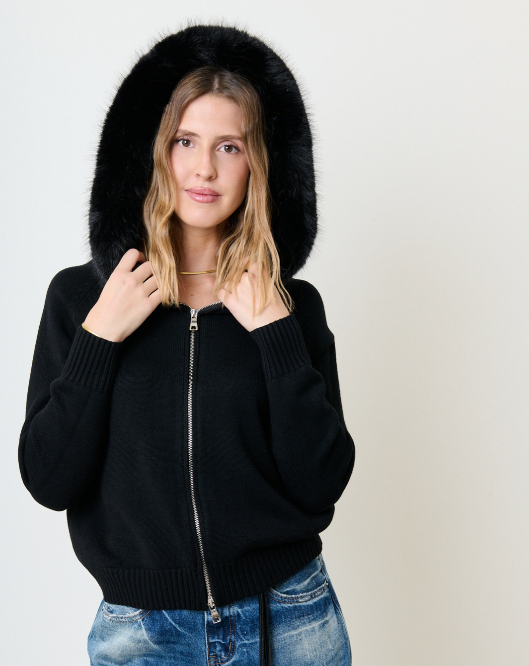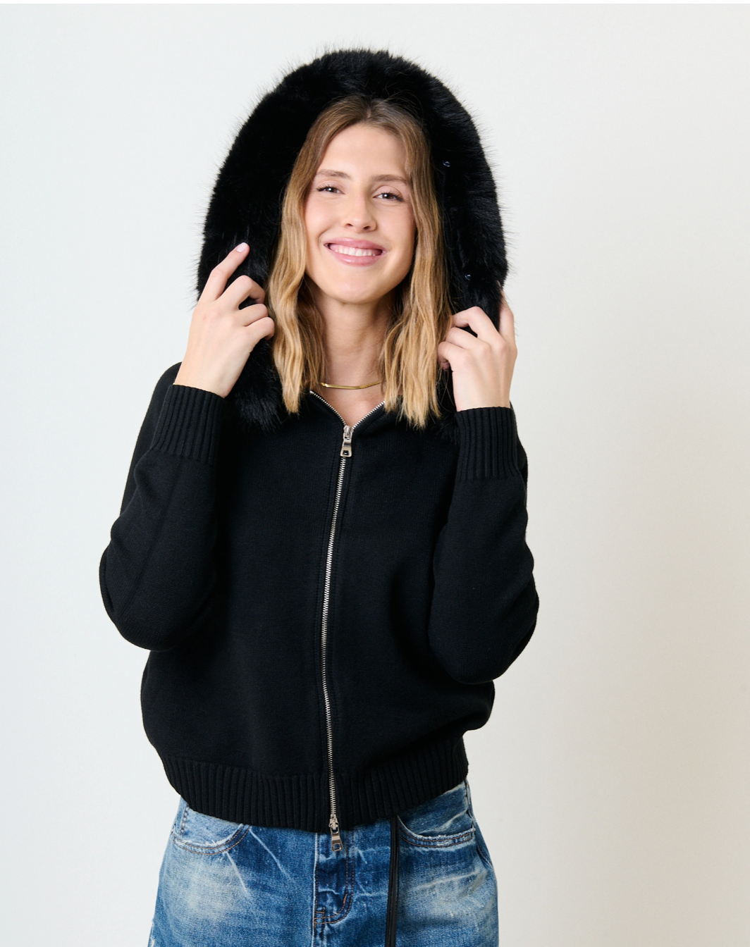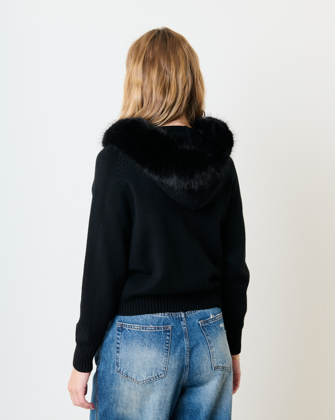 FEEL Cardigan with Zipper Faux Fur Collar - Black