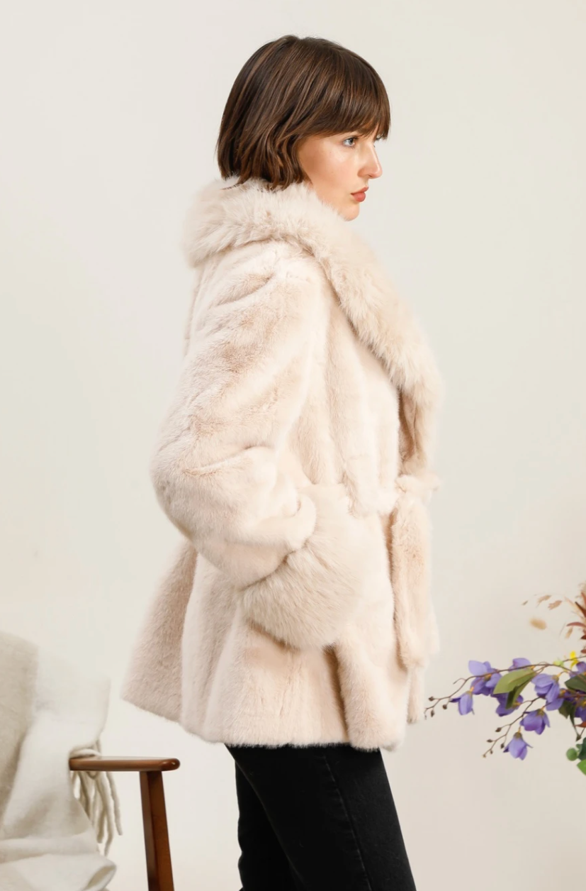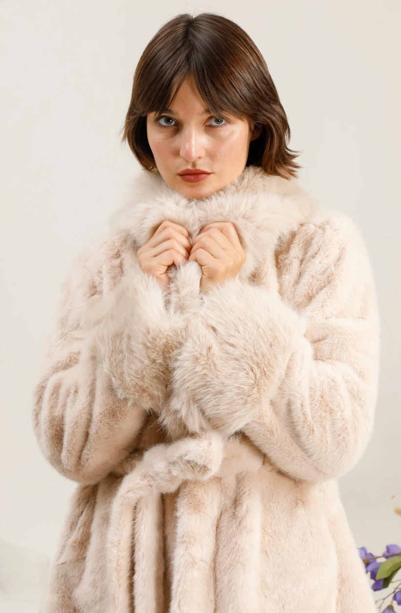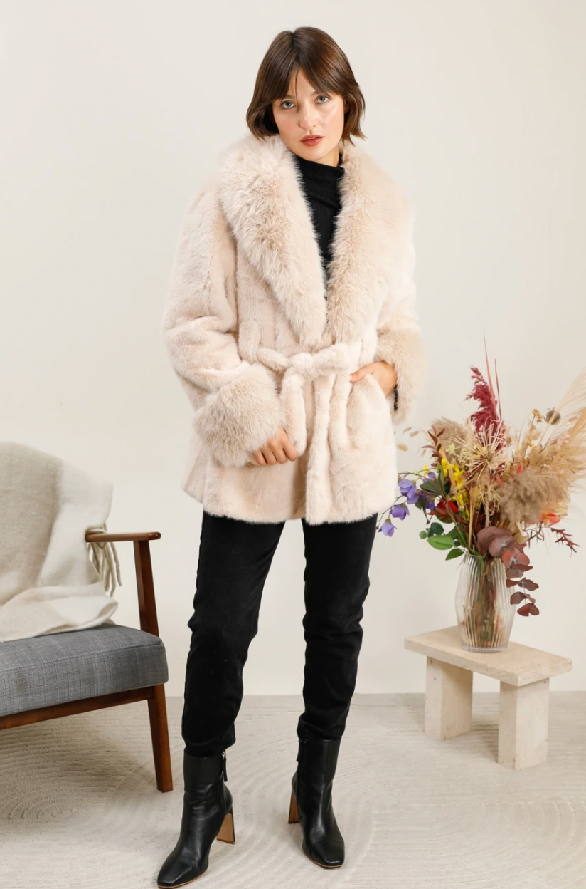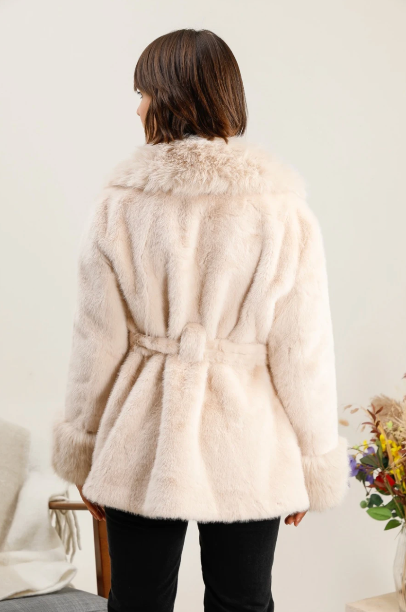Denna ultramjuka fuskpälsjacka kombinerar värme och elegans på bästa sätt. Med en rak passform och ett knytbart midjebälte framhäver den silhuetten på ett sofistikerat sätt.